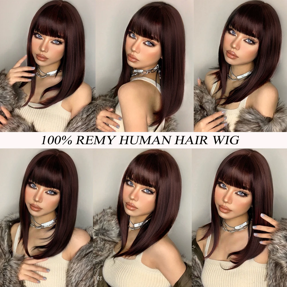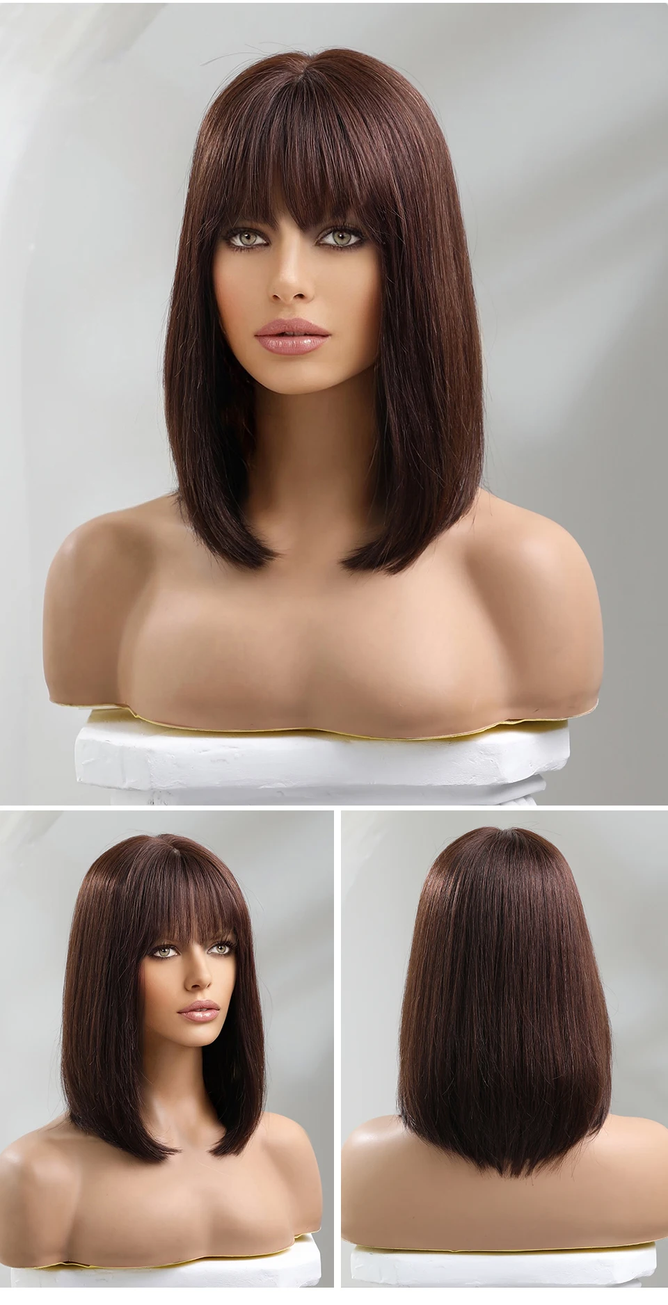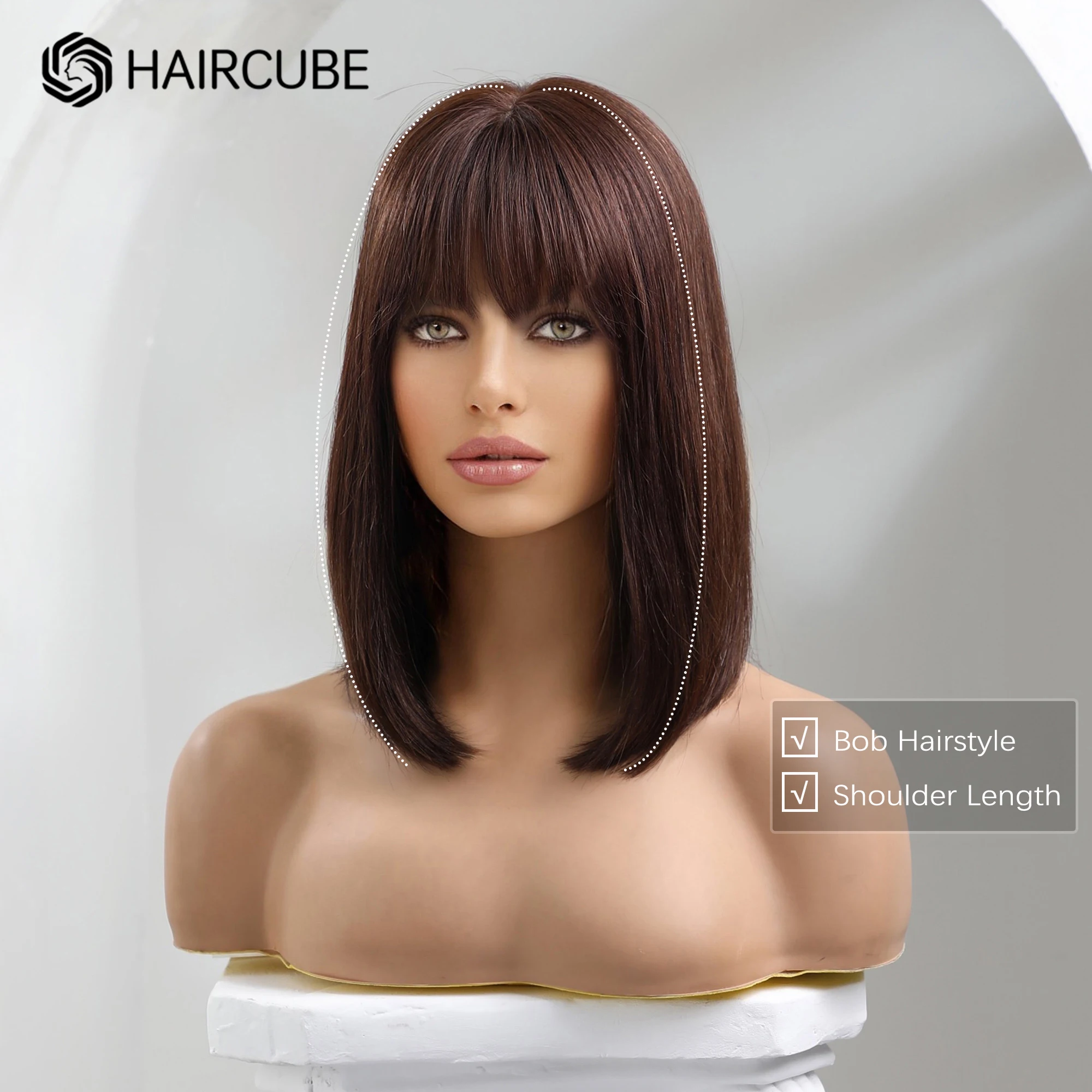 HAIRCUBE Dark Brown Bob Human Hair Wig with Bang Shoulder Length Straight Wigs for Woman Remy Hair Machine Made Heat Resistant