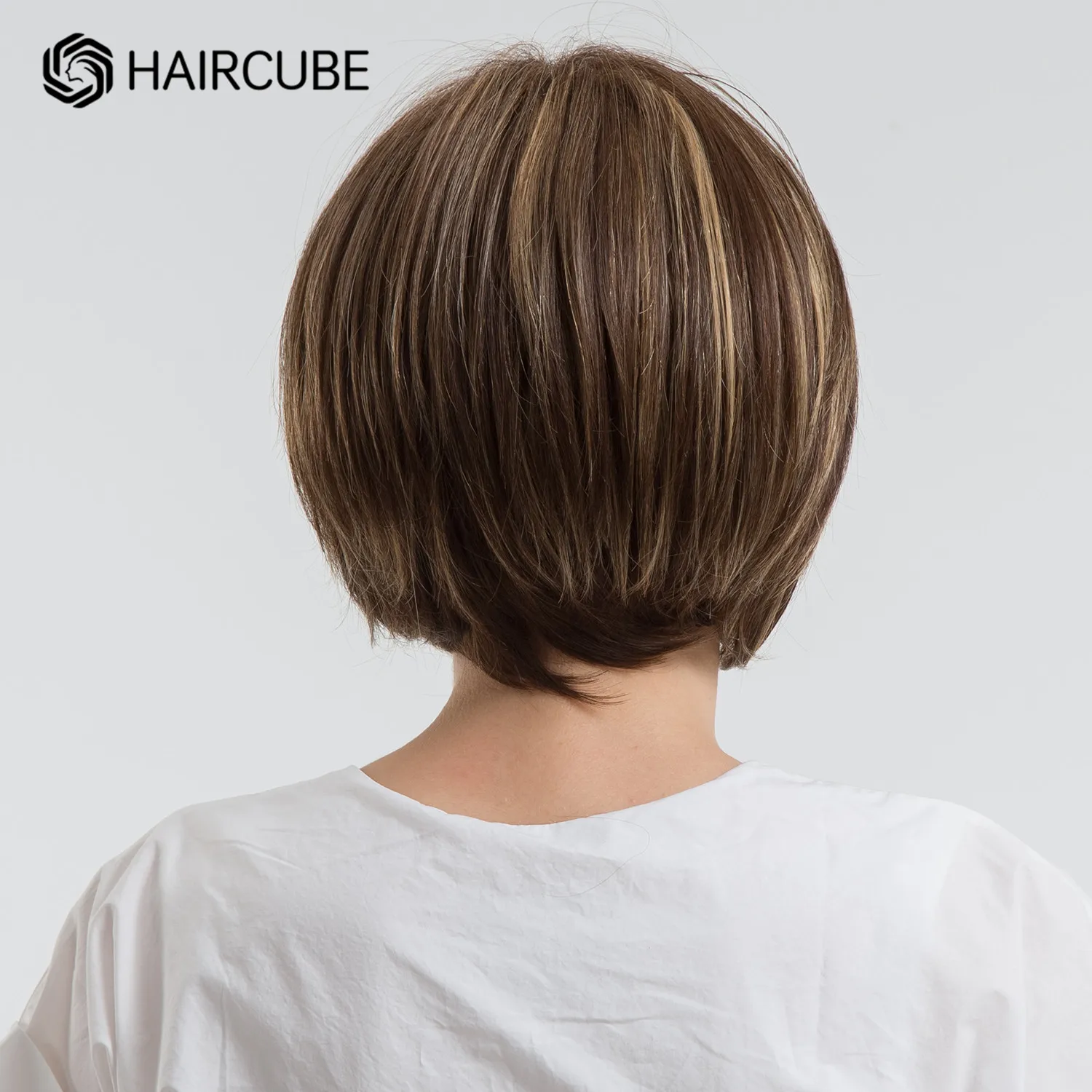 Be the first to review “HAIRCUBE Short Bob Blend Human Hair Wigs Dark Brown Mixed Blonde Highlight Straight Wig with Side Part Bangs Heat Resistant”