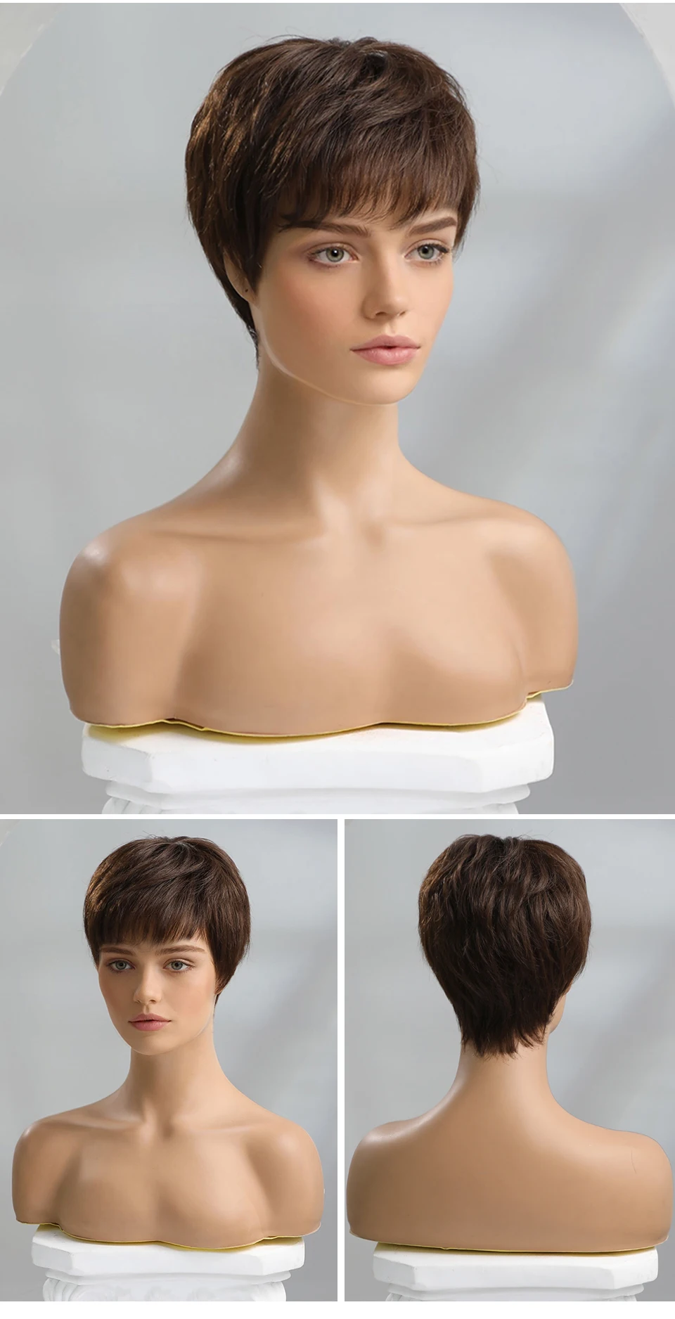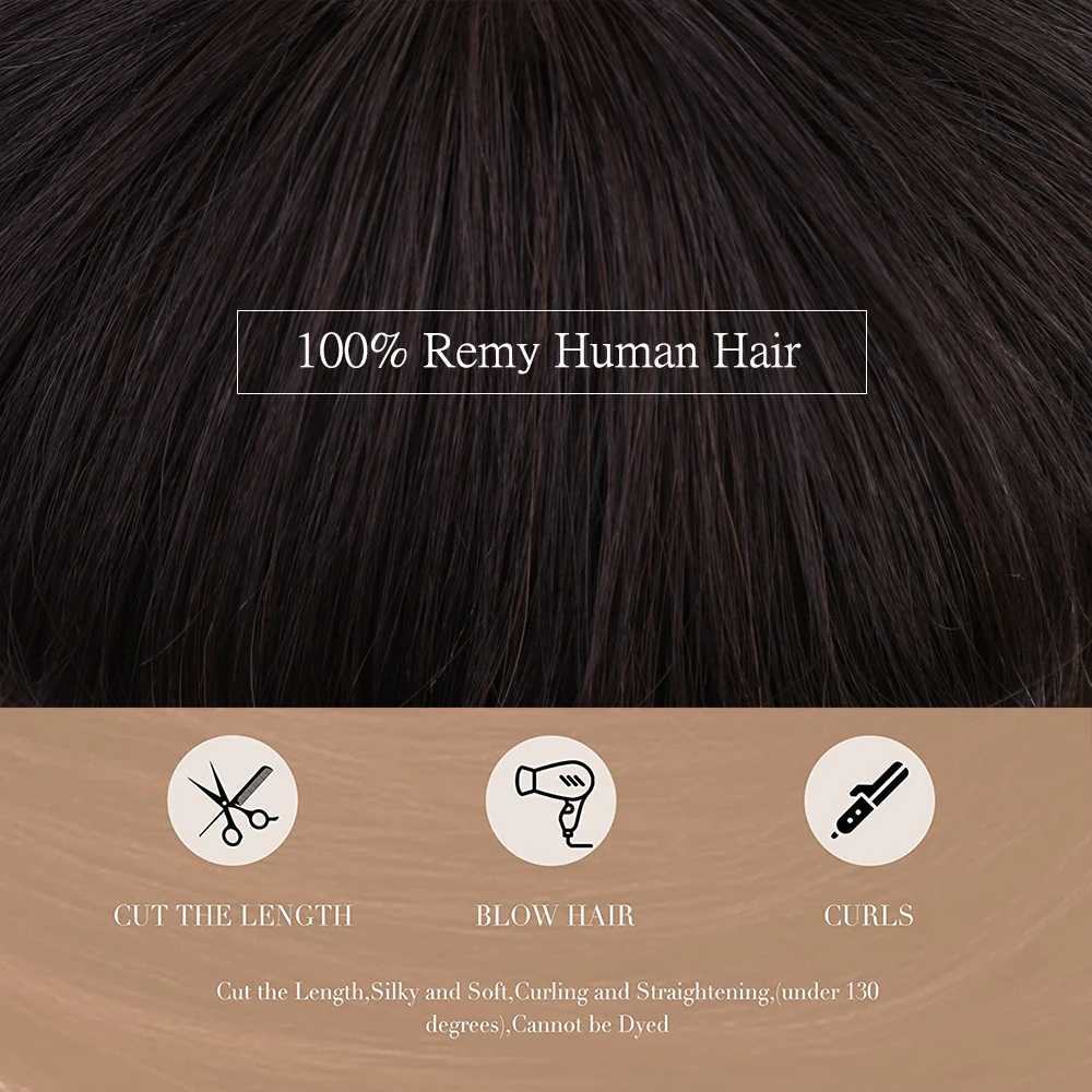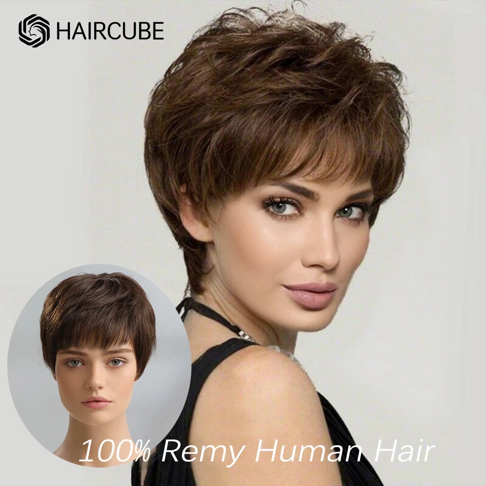 HAIRCUBE Short Pixie Cut Wig Straight Human Hair Wigs for Women Dark Brown Wigs with Fluffy Bangs Heat Resistant Pure Remy Hair